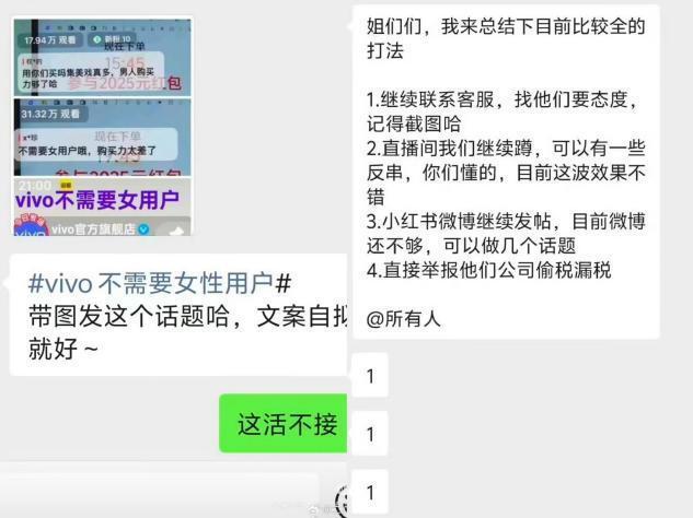 甚至在一些社交平台上,有人针对vivo制定进攻计划,不同级别的账号分工明确,有人负责联系客服要态度,有人负责在直播间反串激化矛盾,还有人执行举报拉黑一条龙,堪称海陆空多维一体作战。