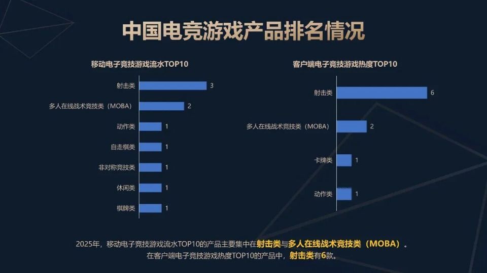 电子竞技游戏产品排名中,2025年,移动电子竞技游戏流水TOP10的产品主要集中在射击类、多人在线战术竞技类、棋牌类。在客户端电子竞技游戏热度TOP10的产品中,射击类占比达60%。