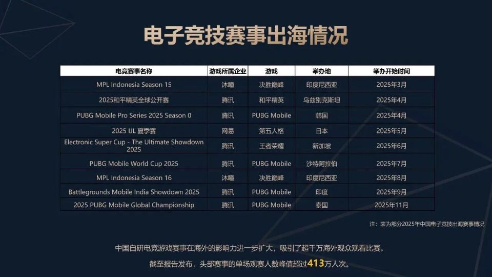 在电竞出海方面,中国电子竞技产业持续深耕海外市场,进一步巩固了在东南亚、中东和拉丁美洲等地区的市场优势。多款国产电竞游戏产品入选2025年电竞世界杯、2026年亚运会等国际顶级赛事。中国自研电竞游戏赛事的海外影响力进一步扩大,吸引超千万海外观众观赛,头部赛事单场观赛人数峰值超413万人次。