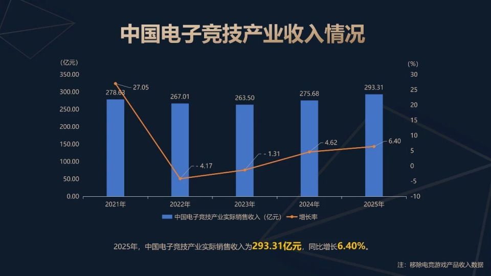 2025年,中国电子竞技产业收入为293.31亿元,相较于2024年的275.68亿元,同比增长6.40%,从2022年起,中国电竞产业收入已实现稳健增长。
