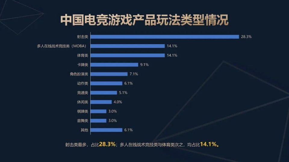《报告》中也详细介绍了国内电竞游戏玩法类型的相应占比。其中,射击类游戏数量最多,占比约28.3%,多人在线战术竞技类次之,占比14.1%,体育竞技类游戏则占14%位居第三大类玩法类型。此外,角色扮演类、卡牌类、竞速类、格斗类等也是相对热门的电竞游戏玩法类型。这些数据为国内电竞产业的发展提供了多元化的方向。