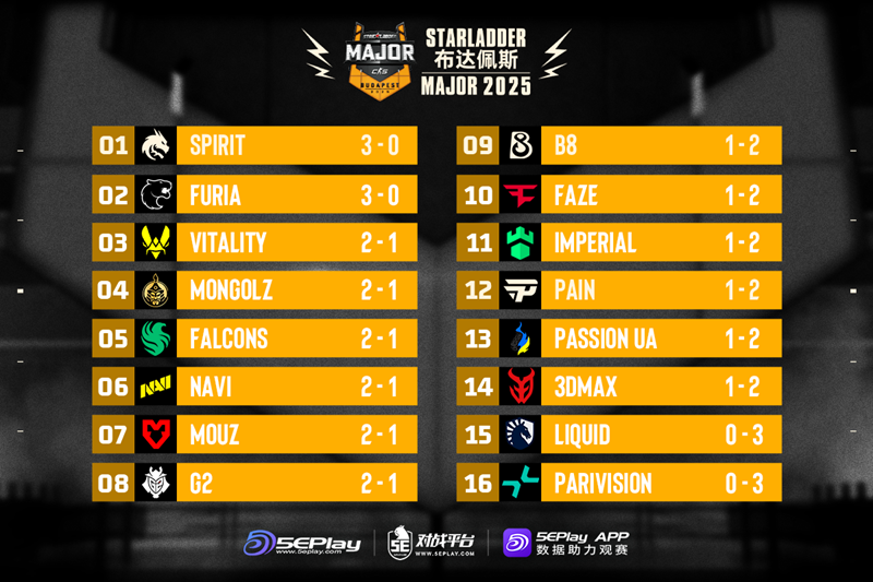 布达佩斯Major第三阶段第二日的比赛已结束。昨晚Spirit与MOUZ的晋级赛中,双方火力全开各下一图,决胜局Spirit在下半场比分劣势的情况下,依靠CT图防守优势逆转比赛。而另一场晋级赛FURIA展现出了TOP1队伍的真正实力,以2-0击败G2。同时1-1组的Vitality、MongolZ、NAVI、Falcons也更进一步,而Liquid与Jame领衔的PARIVISION则在昨晚遗憾告别了本届Major。