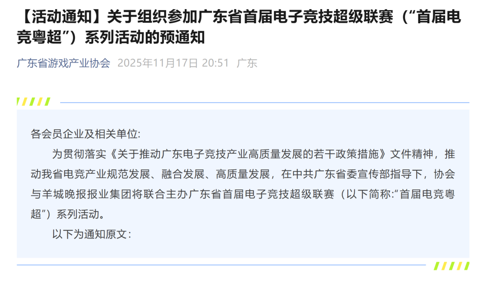 前段时间,广东省游戏协会发布关于组织参加广东省首届电子竞技超级联赛(“首届电竞粤超”)系列活动的预通知。