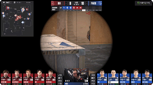 图一Dust2,巴西队拿到手枪局立马被B8翻盘,不过随后的巴西人连下9局一度10-5领先。尽管nqz大狙单局5杀,但凭借kensizor和esenthial两人联手,B8展开绝地追击进入加时。双方鏖战两个加时,kensizor单图砍下28杀帮助B8先下一城。