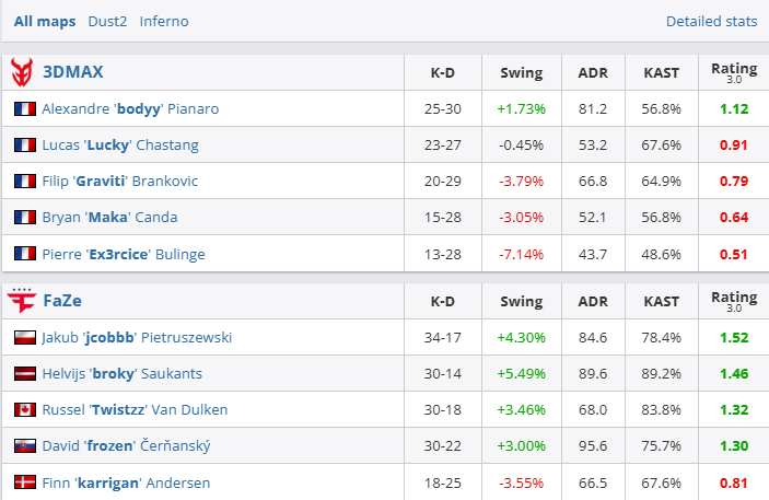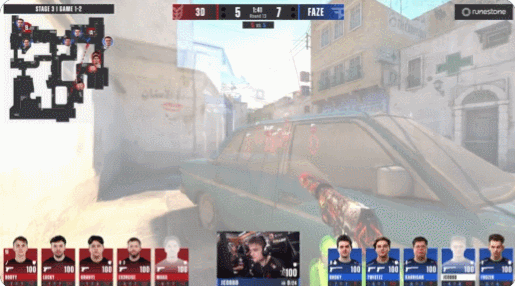 图一Dust2,0-3开局的FaZe在寒王、大表哥状态起势后打出一波7-2结束半场,换边FaZe赢下手枪局,战舰四少全员发威,FaZe连下5局手握赛点。不过大表哥枪口怼Maka脑袋上开枪被对方反杀,法国队拿到进攻首分,但也仅限于此,FaZe轻松先下一城。