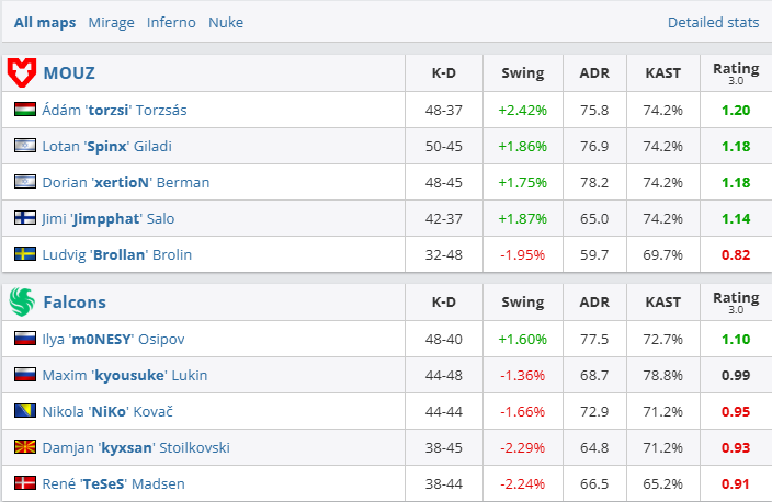 决胜图Nuke,MOUZ拿下手枪局立马被翻,但Spinx沙鹰+AK单局3杀又翻了回来。而后托神从外场甩枪到铁板踩火大狙3杀,MOUZ守出7-1开局。而后NiKo沙鹰3杀成功翻盘,猎鹰半场进攻拿到4分。换边MOUZ再赢手枪局,结果次局尼龙孩马均有斩获完成经济局翻盘,猎鹰追至7-9。长枪局起双方你一分我一分,关键局硬脚蟹下管抄死门取得赛点。终局吉米铁门摸烟手撕小孩和龙哥终结比赛,猎鹰掉入2-2组。