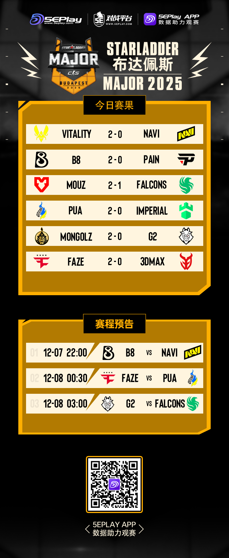 在昨日布达佩斯Major三阶段第三日比赛结束中,2-0组的Vitality轻取NaVi,MOUZ掀翻Falcons,The MongolZ战胜G2,三支队伍成功晋级淘汰赛。同时FaZe在1-2组淘汰了3DMAX,将晋级希望留到了最后一天。