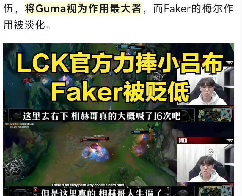 当然也有不少观众认为,LCK官方这是想要强行“力捧”小吕布,毕竟Faker再过几年就要退役,所以LCK官方想要重新“造神”,近几年一直在捧中单Chovy,但是Chovy自己不争气,所以今年LCK官方就开始力捧FMVP小吕布,想让小吕布来当Faker的接班人。(感觉目前LCK赛区当中,只有AD小吕布才能接班Faker,其他几位选手无论是人气还是成绩都差一点)