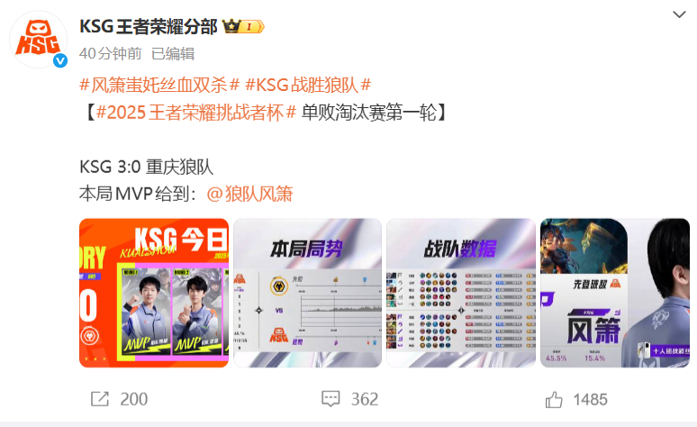 可能有人想到KSG会赢,但应该没想到是这个比分。风箫在老东家面前证明了自己,谁是谁的替补。要是道崽的表现能有这句话一半硬,都不至于被零封。KSG转会期来的这三位一人一个MVP,引援是相当成功了。