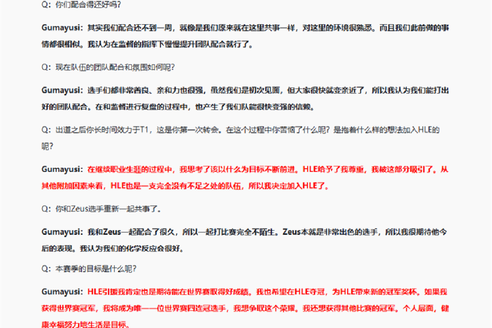 而在离开T1之后,Guma也选择了和宙斯会合,两人的重聚也是被玩家们戏称为“反T1联盟”,并调侃:像T1这种一年放走一位选手的行为,早晚有一天会重组一支四人T1小队,Faker也将迎战曾经的四位队友。在加盟HLE之后,Guma也是接受了采访,此次他被问到:自出道之后长时间效力T1,在这第一次转会的过程中苦恼了什么?是抱着什么样的想法加入的HLE?