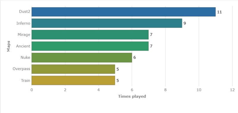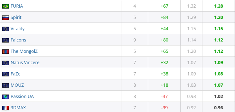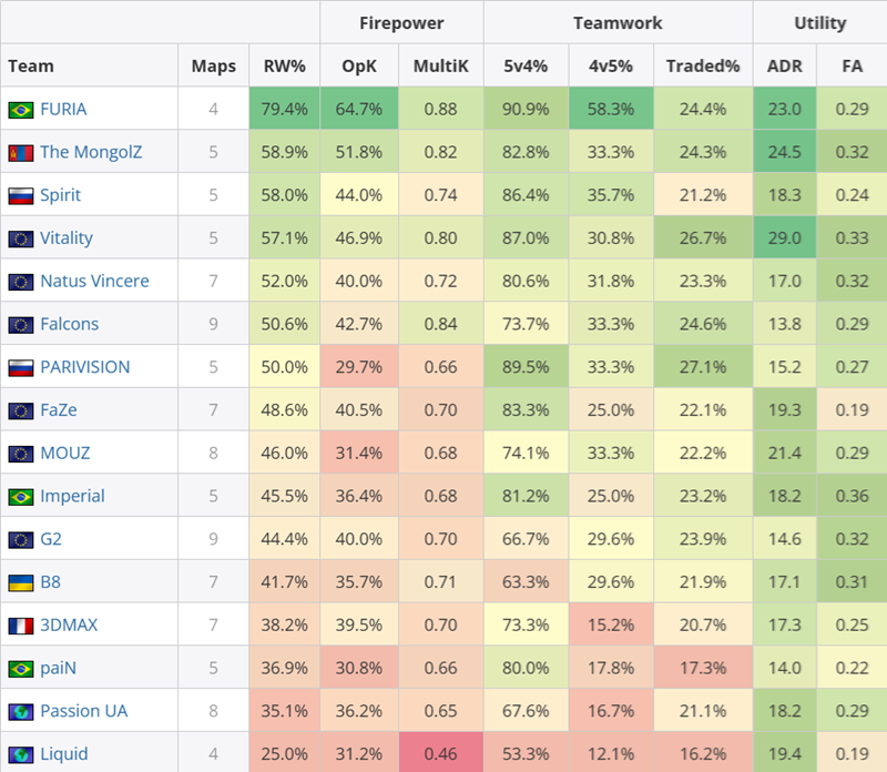 排名第一的是FURIA,四张地图有着1.28的rating,从侧面说明了FURIA当前强大的火力和均衡的个人状态。相比之下,Spirit的rating为1.20,意味着队内有的选手发挥低迷,拉低了donk的高输出数据。