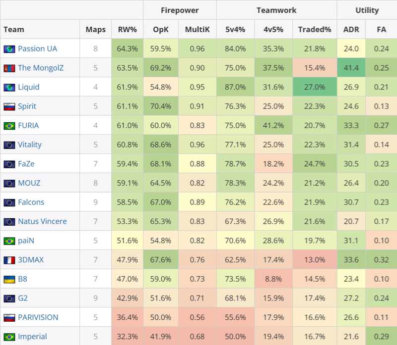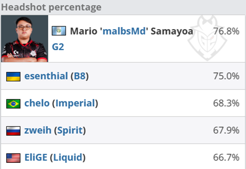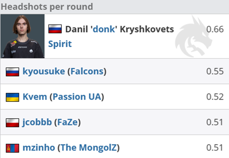 第一名依旧是状态出众的donk,他以平均每回合0.66的高爆头率成功霸榜,比第二名kyousuke高出了0.11。来自Passion UA的Kvem位列第三。