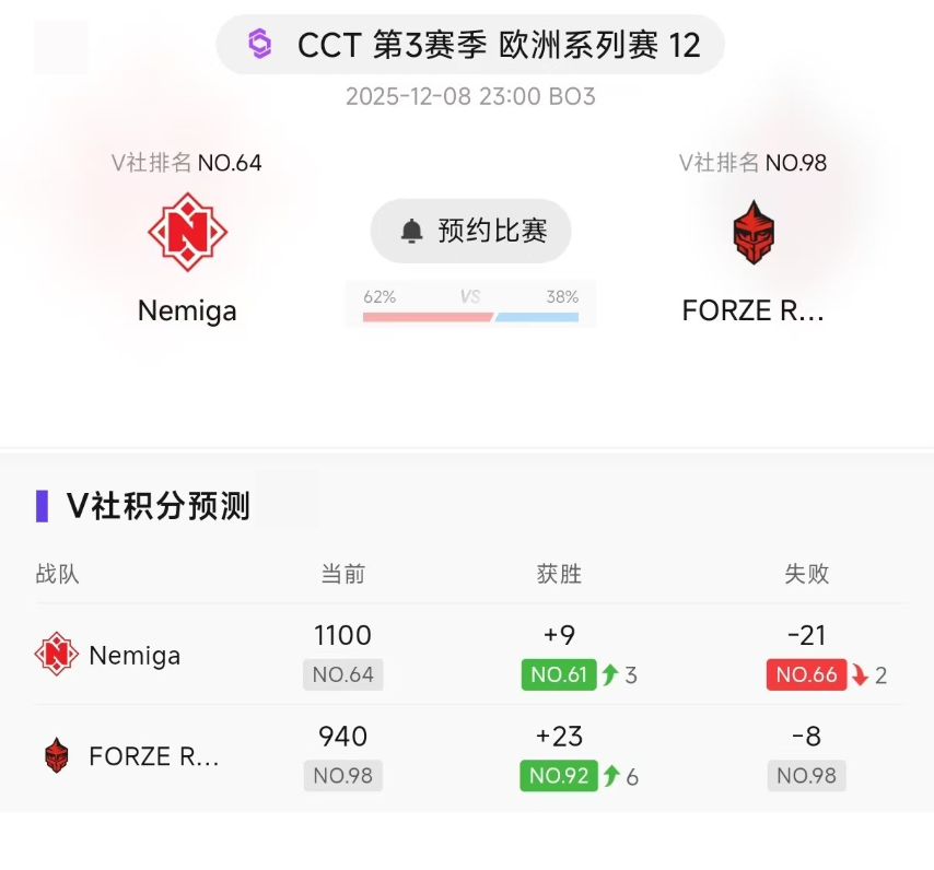独联体二线赛事常驻队伍Nemiga在未能晋级本届Major后,将眼光放到了2026年。近期他们参加的赛事主要目的还是为了赚取足够的VRS积分提升排名,争取在明年获得更多的赛事邀请。今日的两场比赛,他们的对手排名以及硬实力上都有明显的差距,Epg family暂无排名,FORZE Reload位列第98名,并且Nemiga曾以2-0击败过FORZE Reload。从强度上看,Nemiga的两个对手属于欧洲底层实力,Nemiga拿下这两场比赛应该会非常轻松。