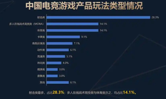 《报告》显示,中国电子竞技游戏主要产品的玩法类型中,射击类产品占比最高,为28.3%。多人在线战术竞技类(MOBA)和体育类次之,占比均为14.1%。按平台分类,移动游戏占比58.6%,客户端游戏占比25.3%,同时具有两种版本的电竞游戏占比12.1%,网页游戏占比4.0%。