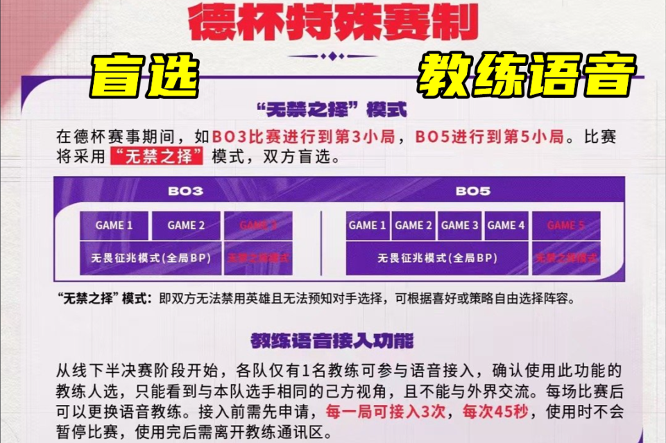 最后就聊聊德杯吧,此次的赛程是已经公布出来了,规则也是有两点不同。第一个是决胜局采用“无禁之择”,也就是盲选模式;第二个则是教练语音,从线下半决赛会开始启用,规则与LCK差不多,只不过LPL各队只允许一名教练参与,LCK那边是两名。期待见到BLG这套阵容的首秀,就是不知道在Daeny教练的带领下,BLG的团队氛围会不会有所好转,要是还和S15一样,怕是也发挥不出阵容的优势。