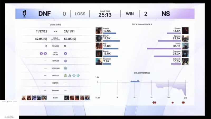 今天第一场比赛,NS以2比1击败C9拿到首胜。随着NS击败C9,只要他们在今日最后一场比赛中击败DNF,那么他们将会进入四强并在胜者组首轮对阵DK。但是DNF,可不那么容易被击败的。