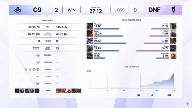 第二场比赛,是Kespa杯LCQ最后机会组的比赛中,C9以2-0横扫DNF。随后将进行LCQ组最后一场比赛由DNF对阵NS,这两队将决胜出晋级队伍。