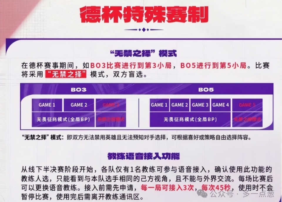 转会期结束后将会迎来第1个赛事,那就是德杯,今年德杯和以往有着很大的不同。今年德杯在决胜局直接采用盲选模式,即双方无法禁用英雄,也无法预知对手选择,可根据喜好和策略自由选择阵容。更关键的是教练语音功能将会接入,只不过到线下半决赛才会接入教练语音。每队只有一名教练参与语音接入,教练会和本选手相同的几方视角且不能与外界交流,每场比赛结束之后都可以更换语音教练,只不过接入需要提前申请,每一局接入三次,每次45秒,使用时并不会暂停比赛。