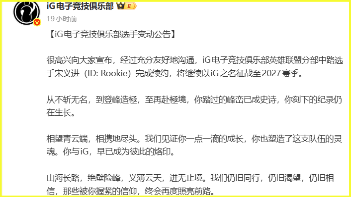 LPL冬季转会期窗口,已经正式关闭了,德杯开赛在即,各大憋气俱乐部,也在近日,陆续官宣新赛季阵容,IG一口气发了三条续约公告,打野Wei、中单Rookie、辅助Meiko,全部续约成功,这三人里,IG只标注了肉鸡的续约时间,双方签到了2027年,这应该是Rookie,最后的两年了。