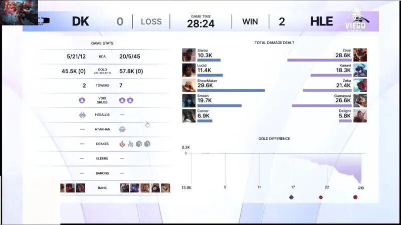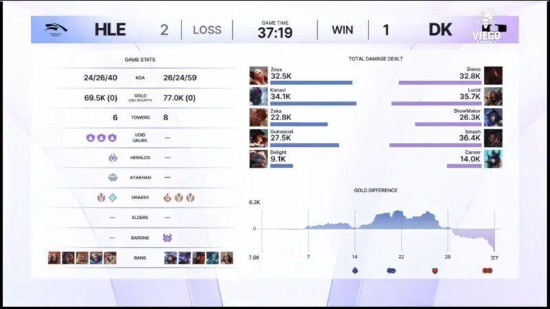 结果这一局比赛,HLE在前期就利用优势,打出了4000的经济领先。比赛第30分钟左右,HLE大龙逼团先后一波打出1换4并拿下大龙;比赛第32分钟左右,DK抓到HLE上野将其击杀,但HLE迅速稳住局面;最终比赛第36分08秒,ShowMaker辛德拉埋伏失败被Zeka发条单杀,HLE击杀DK双C后迅速一波。