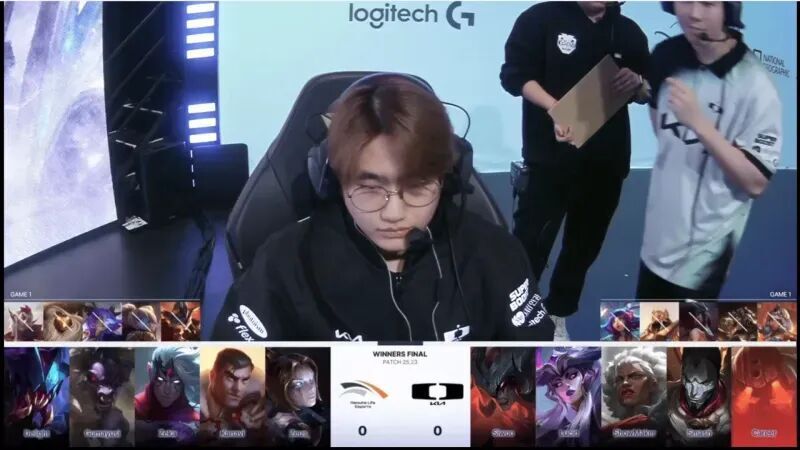决胜局,HLE蓝色方,禁用:盲僧、瑞兹、妖姬、鳄鱼、伊泽瑞尔,选用:Zeus青钢影、Kanavi猴子、Zeka卡牌、Gumayusi艾希、Delight璐璐;DK红色方,禁用:妮蔻、芸阿娜、阿卡丽、安妮、维克托,选用:Siwoo剑姬、Lucid盲僧、ShowMaker瑞兹、Smash梅尔、Career派克