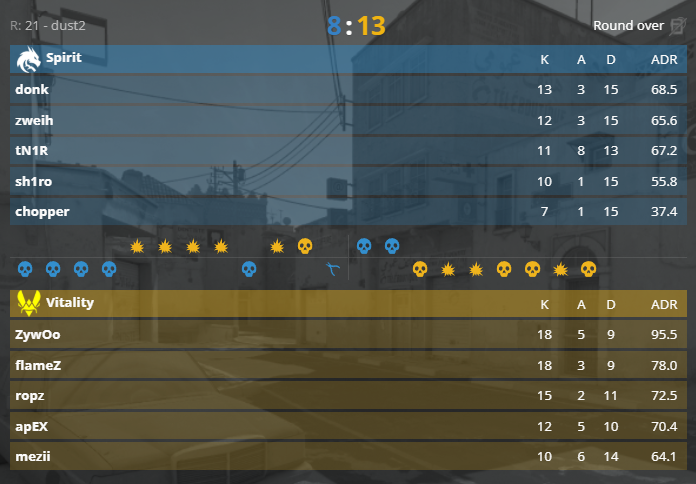 图二Dust2,Vitality粉碎A小攻势赢下手枪局4-0开,长枪局绿龙夹B得手拿到首分,而后zweih沙地开转3杀,sh1ro在B洞顶烟双杀,donk中远秒沙地大狙4杀,半场双方握手言和。换边绿龙拿到手枪局8-6,长枪局chopper背身法玛斯描边助薯薯赢下关键残局。而后大黄蜂进攻接连瞬间融化对手,chopper和sh1ro的防区形同虚设,绿龙兵败如山倒连丢6分止步四强。
