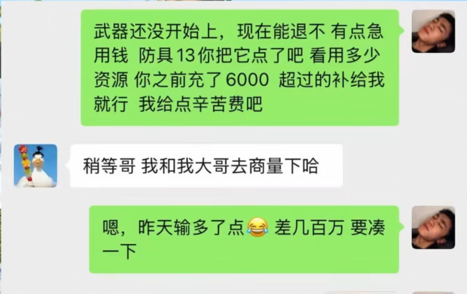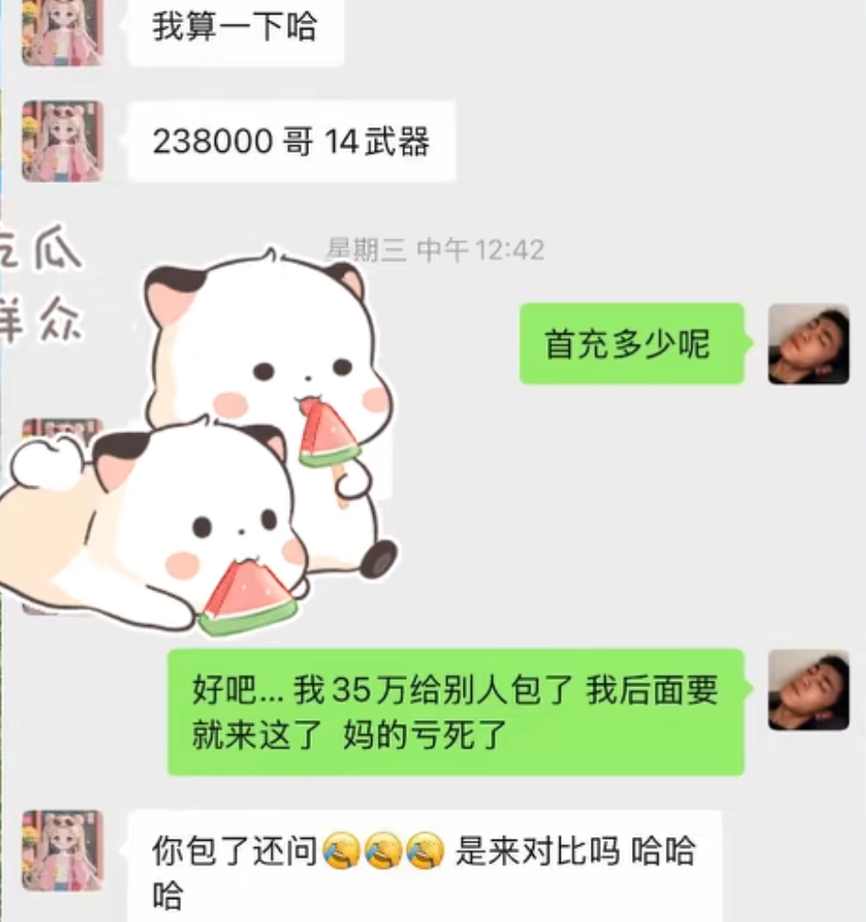 但是又冒出来一个问题,神秘土豪开始找001包了一件增幅13,目前这件装备还没有上去,最开始是协商好了,号主认赔5万,001把差的一件增幅13补上。过了一个晚上,001反悔不增服了,理由是神秘土豪阴阳001,或许是害怕钱不干净,又或许是被网暴压力太大,001直接找帽子叔叔了。神秘土豪也不甘示弱,已经准备好起诉了,但是我感觉胜算不大,估计这个神秘土豪得赔了夫人又折兵。