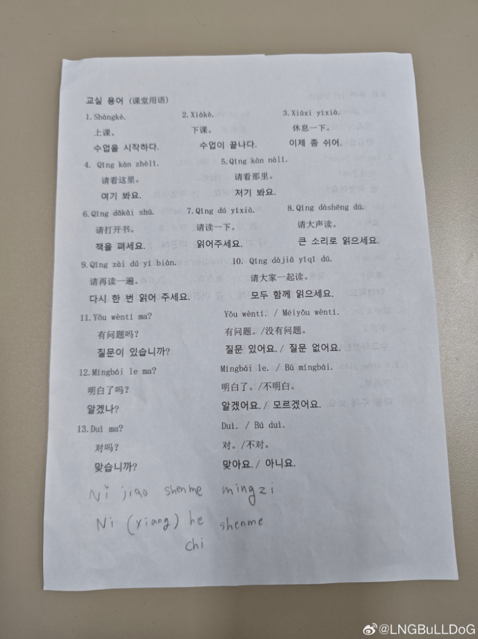 让我们说中文!LNG新韩援晒照学习中文
