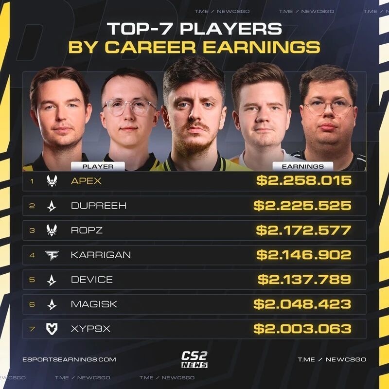 Vitality的队长apEX以2,258,015美元(约1.59千万元人民币)的总奖金位居榜首,成为当前CS中奖金最高的选手。