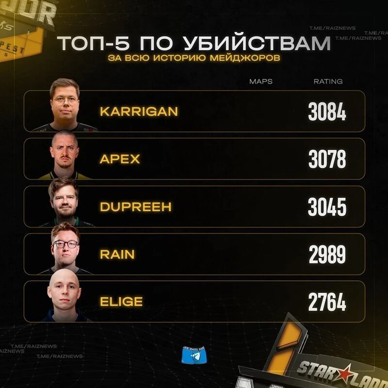 FaZe战队指挥karrigan以3084个击杀的数据位居榜首,成为Major赛场击杀最多的选手。
