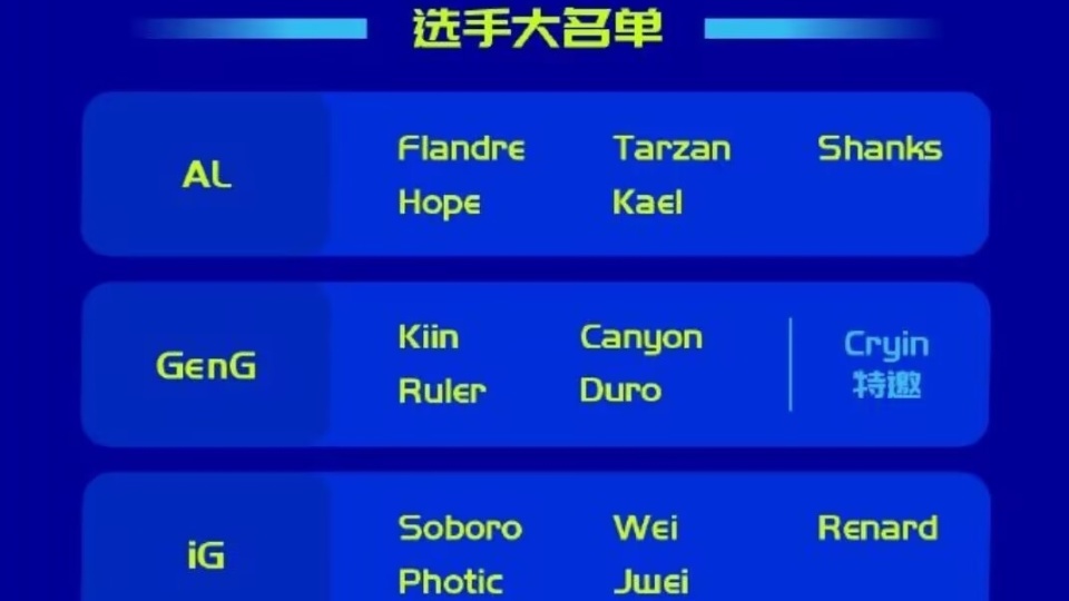 年底娱乐型的赛事确实不少,12月27号,LPL和LCK部分队伍,要参加濮院电竞节,受邀队伍有AL、IG、GEN,这三队除了GEN外,都是全一队首发,Chovy因为正在军训被迫缺席(29号结束),GEN空出来的中单位置,将由LPL退役中单Cryin顶替,果子哥这次,也是玩上顶级号了。