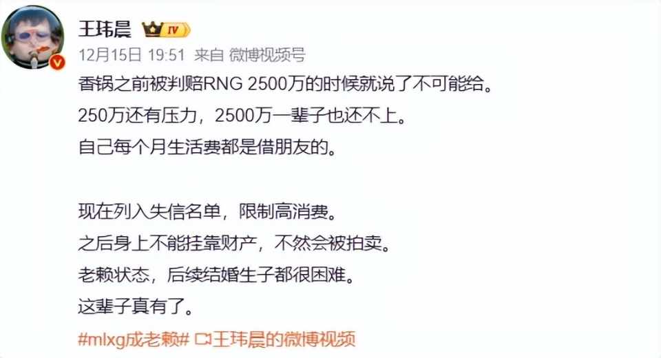 直接成为了失信人员,2500万确实夸张,但是就像Mlxg自己所说,250万还有压力,但是2500万,就真的太扯了,明显是还不了。Mlxg也表示还是会继续上诉的,就是不知道能否成功了。
