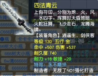 龙拳出了一把顶级的不磨,130级的剑,伤害+537,命中+507,敏耐双加38,特效是永不磨损。