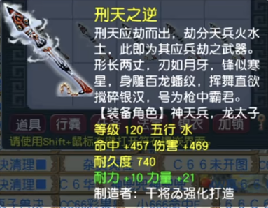 齐天大圣的120级的枪,伤害+469,命中+457,耐力双加31,这个力五庄可以用!