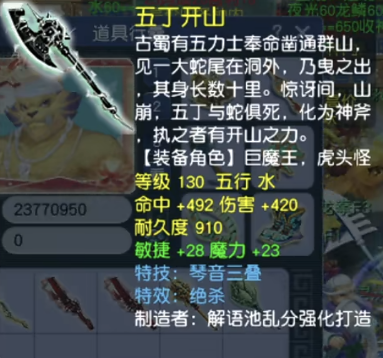 龙拳出了130级的斧子,命中+492,伤害+420,魔敏双加51,还带着琴音三叠+绝杀,可惜伤害太低了。要不然绝对的魔王神器了!