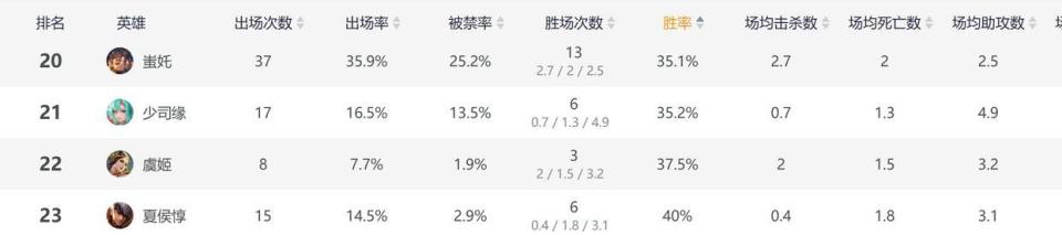根据KPL官方给出的最新数据榜单来看,蚩奼这名英雄在挑杯一共上场37次,可胜率仅为35.9%,排在全英雄倒数第20,。虽然从排名的角度来看,后面还有很多英雄胜率更低,但后面的很多英雄,出场次数只有一两场,胜率数据不具备参考性,像蚩奼这种出场率又高、胜率又低的英雄,真的很少见。
