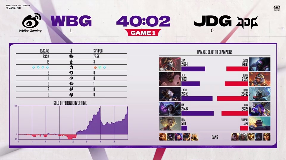 中期双方争夺厄塔汗,小虎发条R到junjia杰斯将其击杀,WBG拿下厄塔汗,打出0换3。26分钟junjia杰斯被抓死,WBG拿下第一条大龙。最终29分钟WBG在高地直接拆基地,拿下比赛的胜利。
