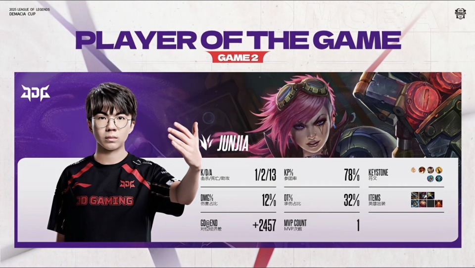 德玛西亚杯小组赛第二赛段,迎来了WBG和JDG的BO3,两队都启用了新赛季的阵容,WBG上单Zika,打野jiejie,中单小虎,下路ELK加Erha;JDG上单xiaoxu,打野junjia,中单HongQ,下路Gala加Vampire。最终WBG以2-1的战绩击败JDG,拿下新阵容首秀的胜利!