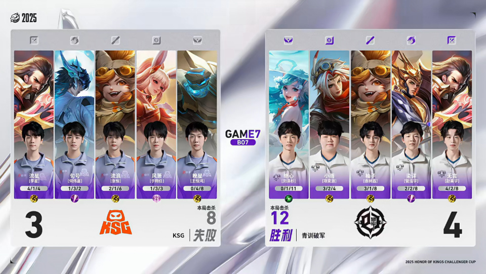 暴君团战在染祥杨戬刚复活的情况下,青训破军还是不想放。句号拿到了龙,但无言闪现配合柚子强切公孙离,风箫又没了,句号大招坐进去看着很猛,但结果也顶不住对面多人集火,龙拿到了,团打输了。青训破军拿到优势之后,经济差滚得很快,14分钟的暴君拿到之后,晚星的盾山被留住。五打四的情况下,风箫的公孙离在水晶前被无言秒了。青训破军一波拿下,4-3战胜KSG。