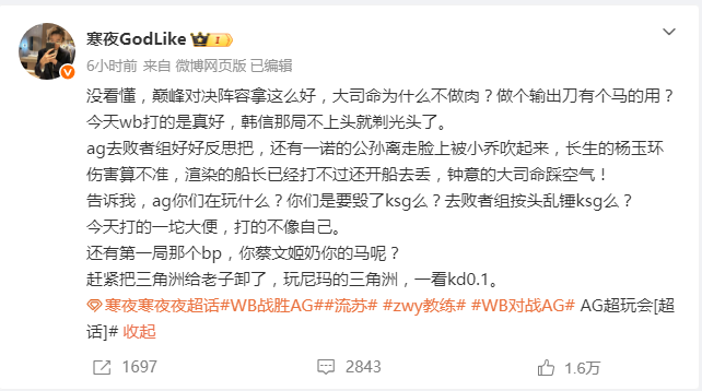AG失败,俱乐部未必在乎,觉得冠军拿的够多,只想商务挣钱,但是粉丝难受,22年,AG逐渐走出低谷,好不容易进入世冠,就在19号,被WB淘汰。