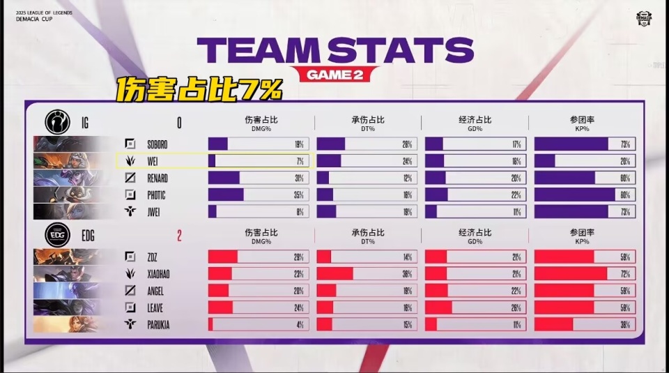 EDG以2:0的比分,零封IG赢下比赛,打野Xiaoaho,连续两场对位Wei砍下MVP,比赛打到22分钟,小Wei战绩0-2-0,没有击杀没有助攻,琪亚娜这种野核英雄,伤害占比居然低至7%,比自家辅助Jwei的波比,还低了1%,基地爆炸的时候,弹幕齐刷惊天大涅槃,可见观众都是很失望的。
