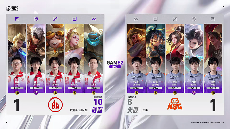 第一局,AG超玩会被KSG打了一个1-7。第二局,KSG在优势的情况下,没有抓住机会,被AG逆转!3分钟中路,KSG迅速支援击杀夏侯惇拿下一血,随后KSG继续进攻,不知火舞击杀对方射辅拿下二连击破,KSG顺势拿下首条小暴君。8分20秒,双方团战1换1,但KSG破掉对方中路一塔。