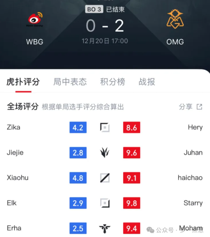 在很多粉丝眼里,WBG再怎么样也不可能说一支涅槃队伍,更何况这还是OMG,基本就是LPL垫底的队伍。很显然,WBG现在存在着很大的问题,而且内部肯定也有不小的分歧。主要是小虎他是真的心累,每次都是自己表现比较出色,但是队友真的是不行。本以为换了队友可以让整支队伍有所起色,结果还是这样。这场比赛结束之后,小虎获得了4.8分,是他们队伍中的最高分。Jiejie获得了2.8分,EIK获得了2.9分,二哈更是获得了2.5分。这三人获得了这么低的分数,就足以说明在这场比赛中他们的作用几乎没有。
