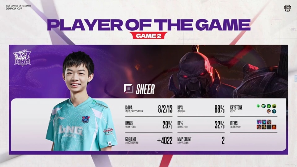 第二局的Sheer祭出塞恩的情况下,竟然打出了全场最高伤害,直接斩获了二连MVP。