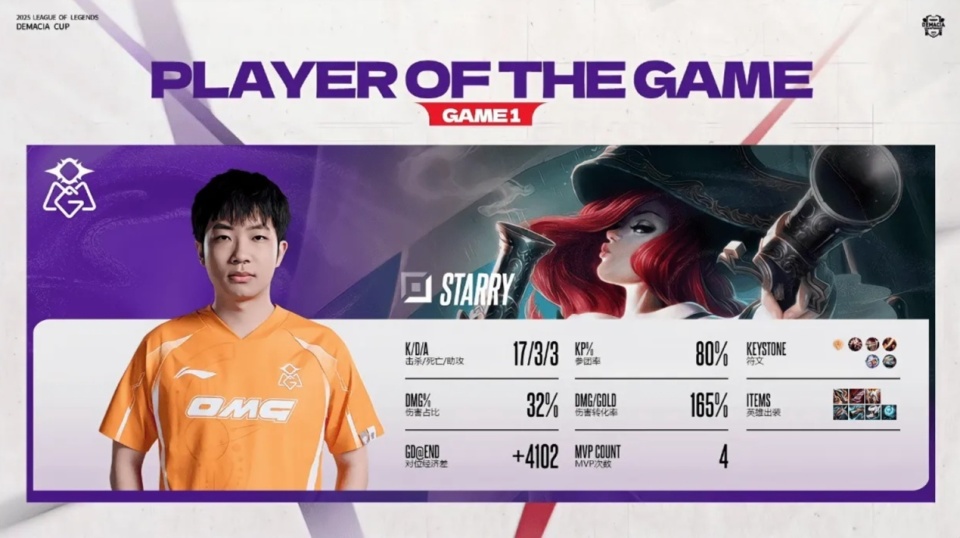 Starry以女枪全场打出了17次击杀,前期的反越塔和中期的大招清场都起到了很好的作用。