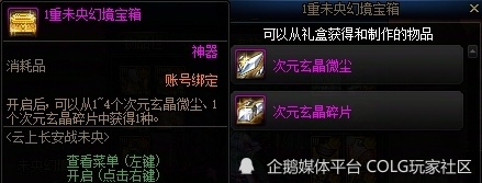通关未央幻境以后有一定概率会掉落对应阶重的【未央幻境宝箱】,打开以后可获得次元玄晶微尘、次元玄晶碎片或次元玄晶道具。