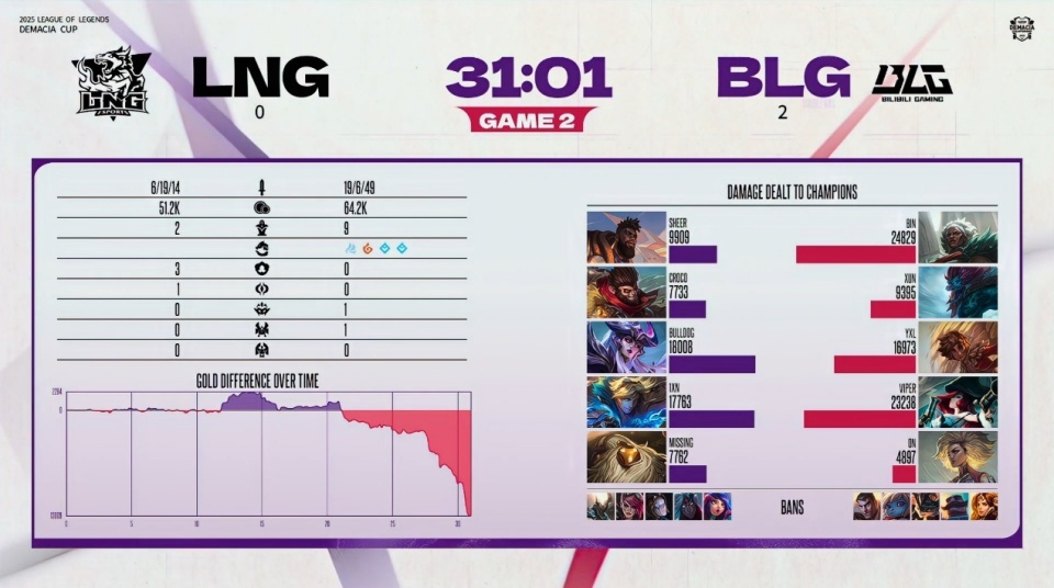 面对之前爆冷击败JDG的LNG,BLG是以2-0的比分轻松碾压取得胜利。