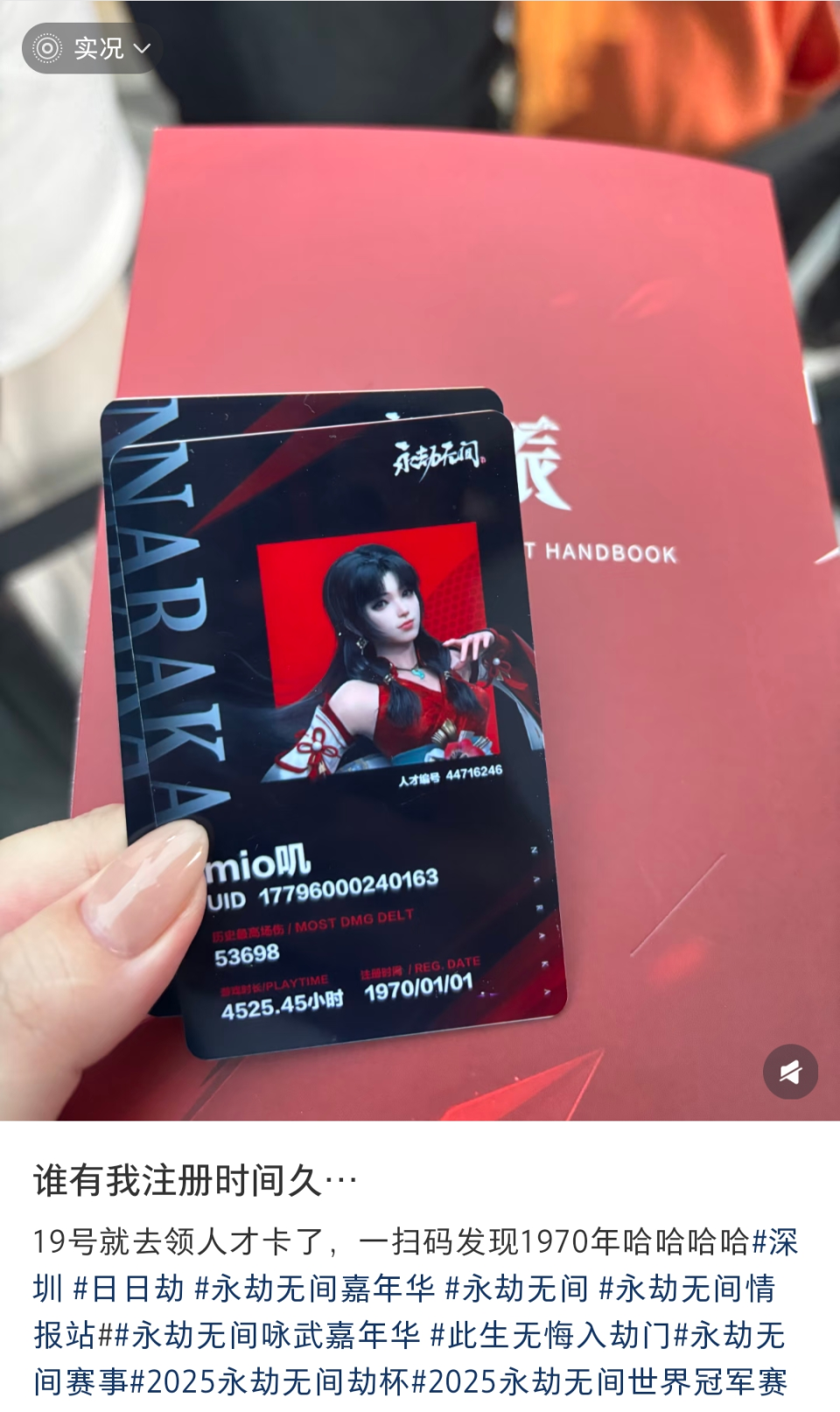 除了之前提到的巨型宁红夜雕塑,《永劫无间》还搞了个“深振人才卡”的neta设定,用带有城市特色的身份认证,构建玩家认同感。而在打印时,有玩家触发了系统bug,注册时间显示成了1970年,帖子发到网上,立马有人在评论区吐槽:“聚窟洲来了个元谋人。”