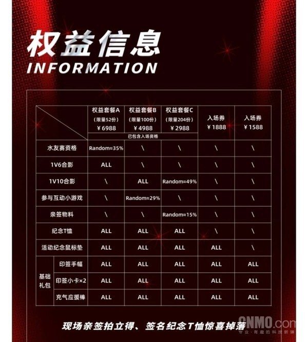 此外,官方票务平台还公布了完整的售票信息及各个档位情况,门票分为“入场券”和“权益套餐”两大种类,共计五个价格档位。购买各个级别权益套餐的粉丝将有一定机会获得Faker亲笔签名与合影留念机会。最高档6988元的权益套餐,则有35%机会在水友赛中与Faker同场竞技。