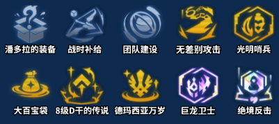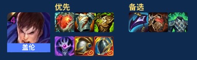 这套阵容比较需要的是打中期的压制换取后期的容错,所以优先考虑战力海克斯,类似战时补给反曲弓,团队建设,无差别攻击,光明哨兵,大百宝袋,德玛西亚万岁,巨龙卫士,绝境反击这些